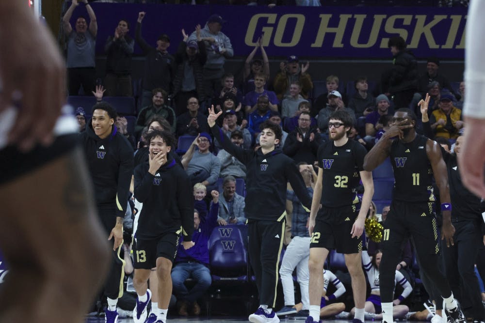 The UW men's basketball bench players walk on the court in celebration of a basket during UW's game against Northwestern on Feb. 8, 2025 at Alaska Airlines Arena in Seattle.