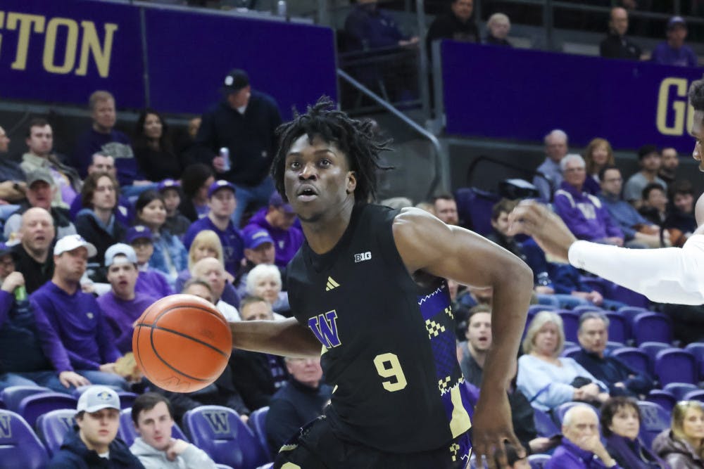 Guard Vazoumana Diallo dribbles toward the basket during UW's game against Northwestern on Feb. 8, 2025 at Alaska Airlines Arena in Seattle.