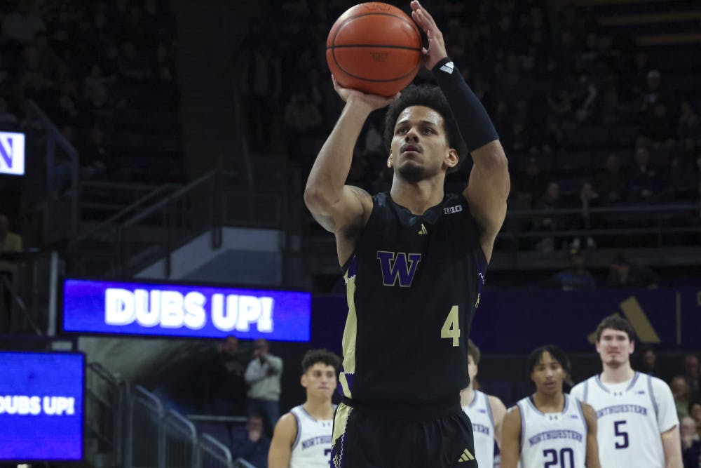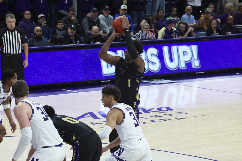 Guard DJ Davis takes a free throw shot in result of Northwestern's technical fouls during UW's game against Northwestern on Feb. 8, 2025 at Alaska Airlines Arena in Seattle.