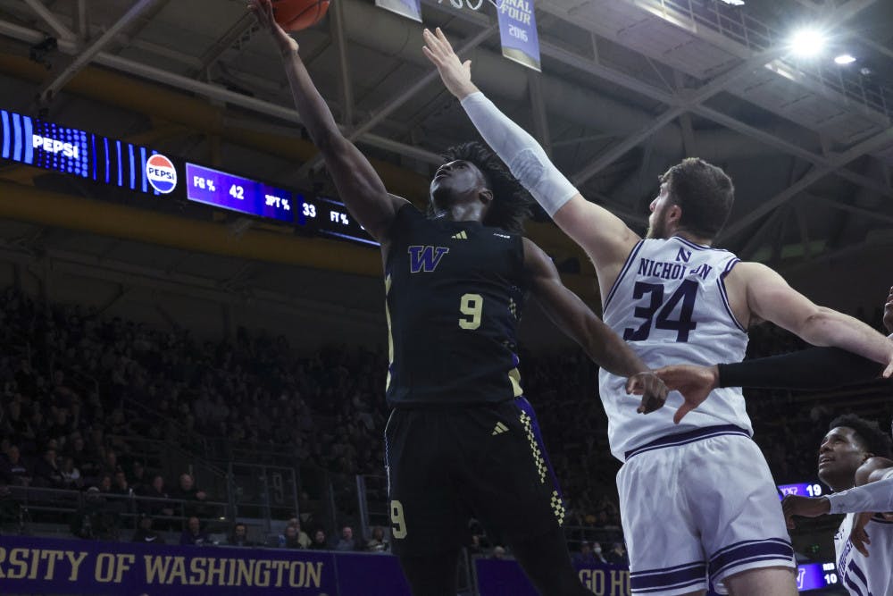 Guard Vazoumana Diallo drives to the hoop during UW's game against Northwestern on Feb. 8, 2025 at Alaska Airlines Arena in Seattle.