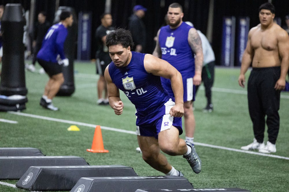 Senior defensive lineman Voi Tunuufi completes a position drill during Washington's Pro Day at Dempsey Indoor Center in Seattle, Washington on March 10, 2025.