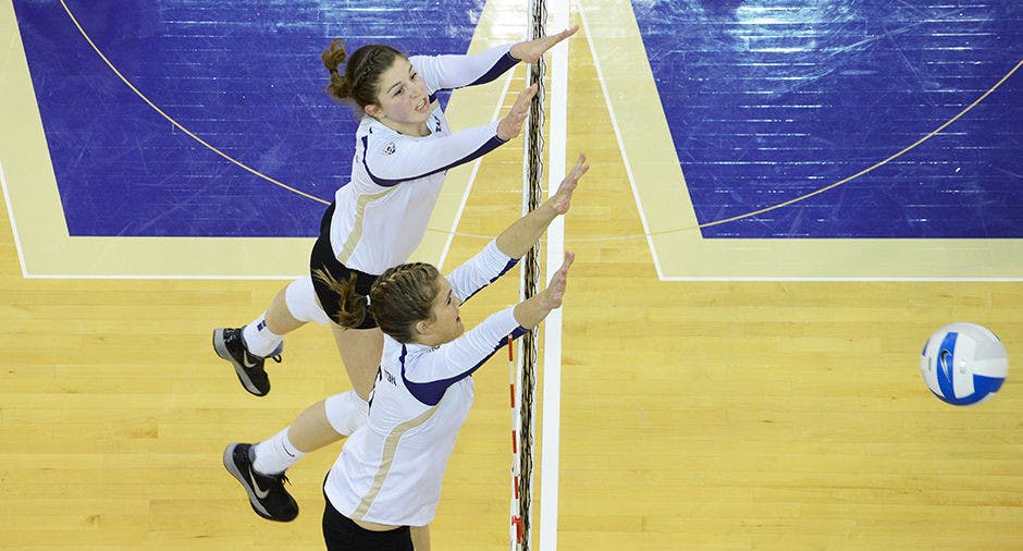 Melanie Wade (top) led the Huskies with eight block assists and one solo block against California last weekend as part of a 16-block performance from the UW. Blocking was a big part of the UW's win over the Bears and will be critical this weekend as the Huskies try to win the Pac-12 title.