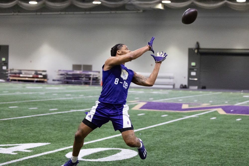 Senior safety Cameron Broussard prepares to catch the football during Washington's Pro Day at Dempsey Indoor Center in Seattle, Washington on March 10, 2025.