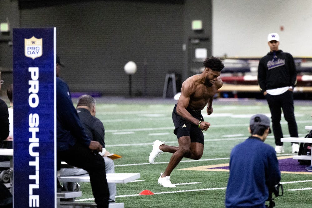 Senior wide receiver Jeremiah Hunter completes the pro shuttle as NFL personnel watch on during Washington's Pro Day at Dempsey Indoor Center in Seattle, Washington on March 10, 2025.
