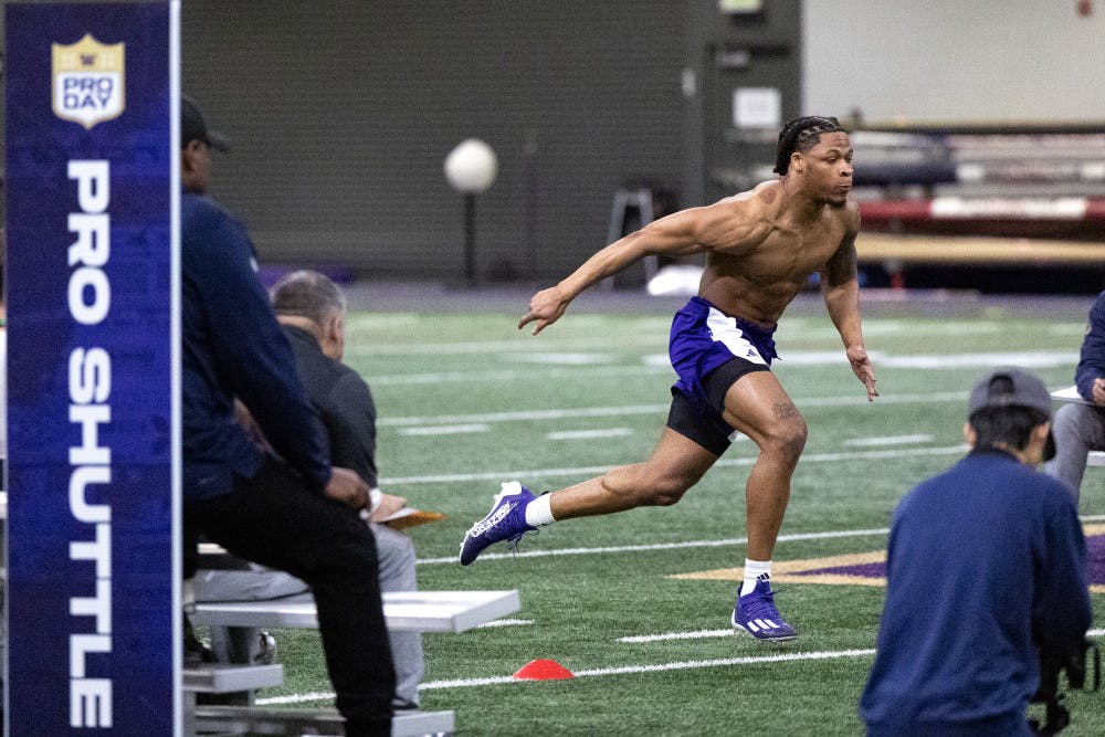Senior safety Cameron Broussard completes the pro shuttle during Washington's Pro Day at Dempsey Indoor Center in Seattle, Washington on March 10, 2025.