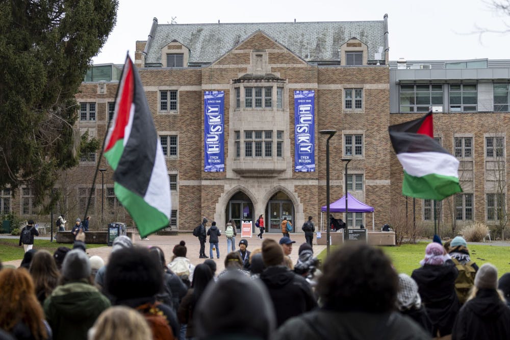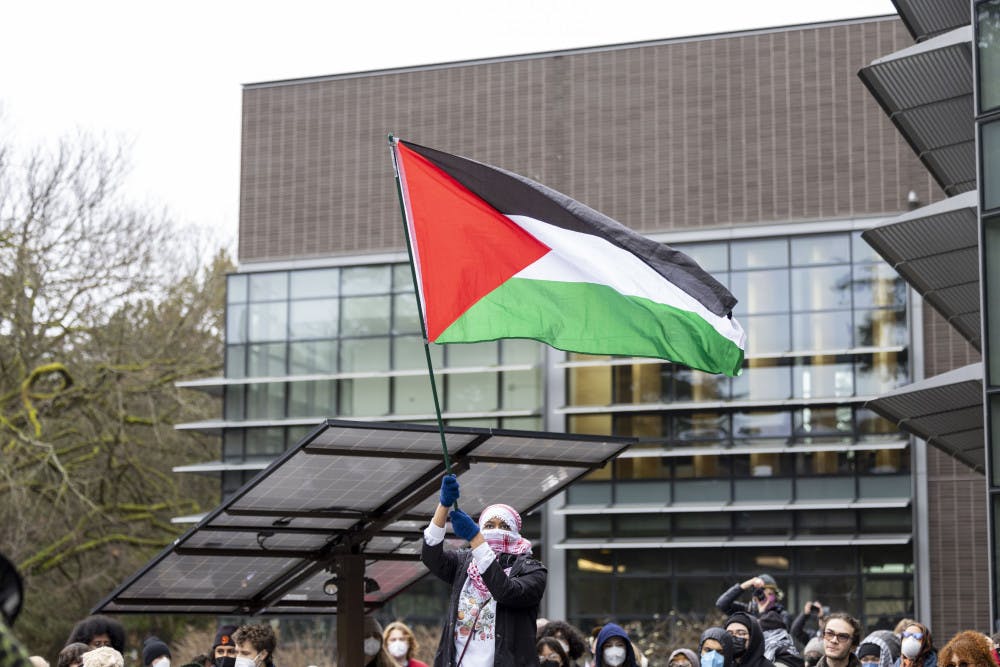 A participant waves a Palestine flag outside of The HUB during SUPER UW's "Flood UW for Palestine" March and Rally at the University of Washington on Feb. 5, 2025, in Seattle.