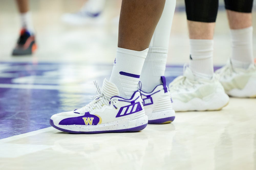 Senior Guard DJ Davis cleans his shoes to play defense during UW Men's Basketball's game against Nebraska on February, 5th 2025. at Alaska Airlines Stadium in Seattle, WA.