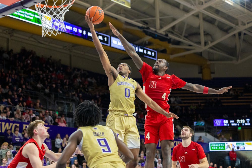 Sophomore Guard Tyler Harris attempts to block a shot during UW Men's Basketball's game against Nebraska on February, 5th 2025. at Alaska Airlines Stadium in Seattle, WA.