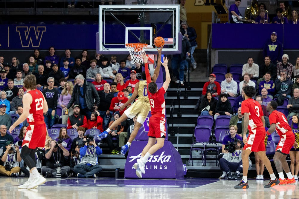 Senior Guard Tyree Ihenacho blocks a shot during UW Men's Basketball's game against Nebraska on February, 5th 2025. at Alaska Airlines Stadium in Seattle, WA.