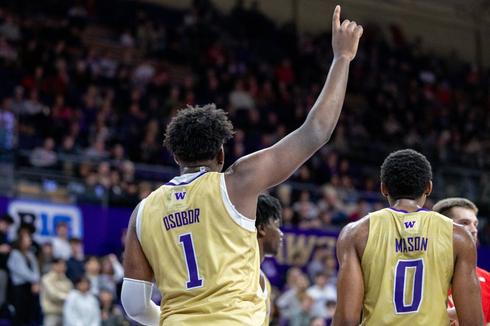 Senior Forward Great Osobor reacts after scoring during UW Men's Basketball's loss against Nebraska on February, 5th 2025. at Alaska Airlines Stadium in Seattle, WA.