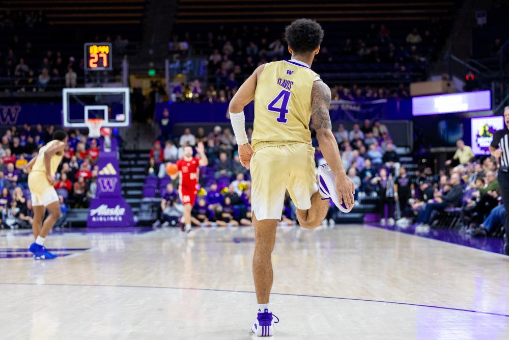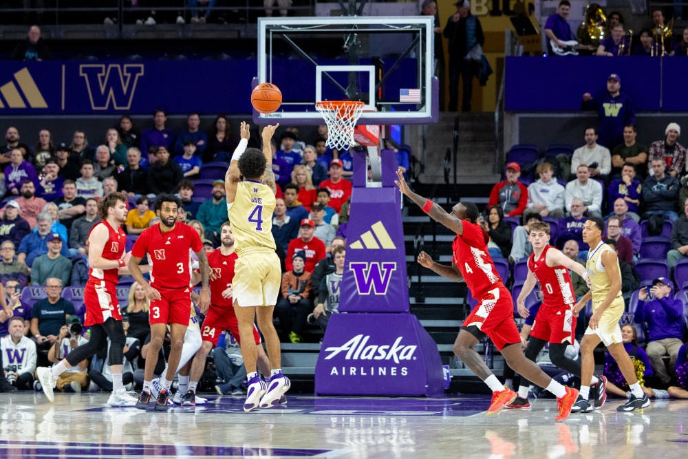 Senior Guard DJ Davis shoots a three pointer during UW Men's Basketball's game against Nebraska on February, 5th 2025. at Alaska Airlines Stadium in Seattle, WA.