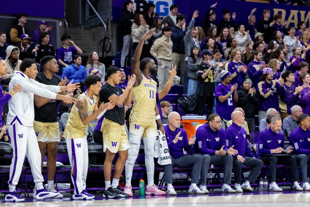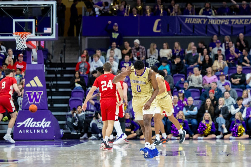 Washington center Franck Kepnang celebrates coming into the game against Nebraska on February 5th, 2025 inside of Alaska Airlines Arena.