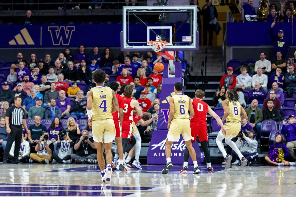 A UW player waits for a free throw to be taken during UW Men's Basketball's game against Nebraska on February, 5th 2025. at Alaska Airlines Stadium in Seattle, WA.