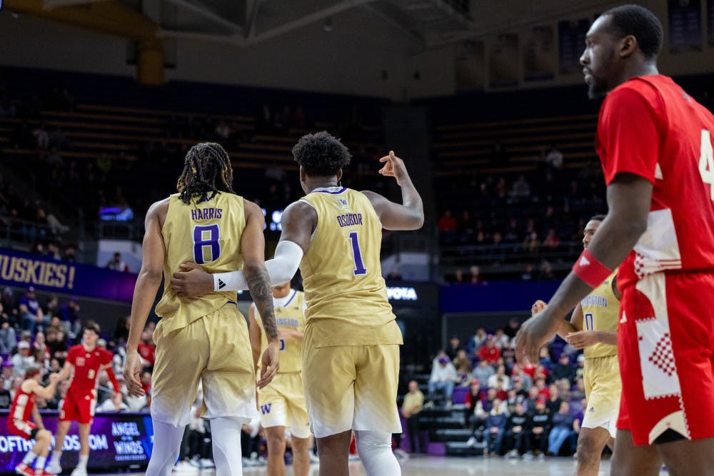 Senior Forward Great Osobor scores a three pointer during UW Men's Basketball's game against Nebraska on February, 5th 2025. at Alaska Airlines Stadium in Seattle, WA.