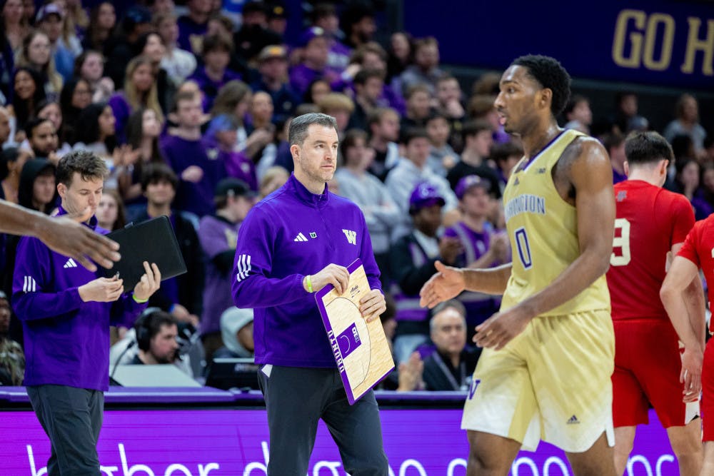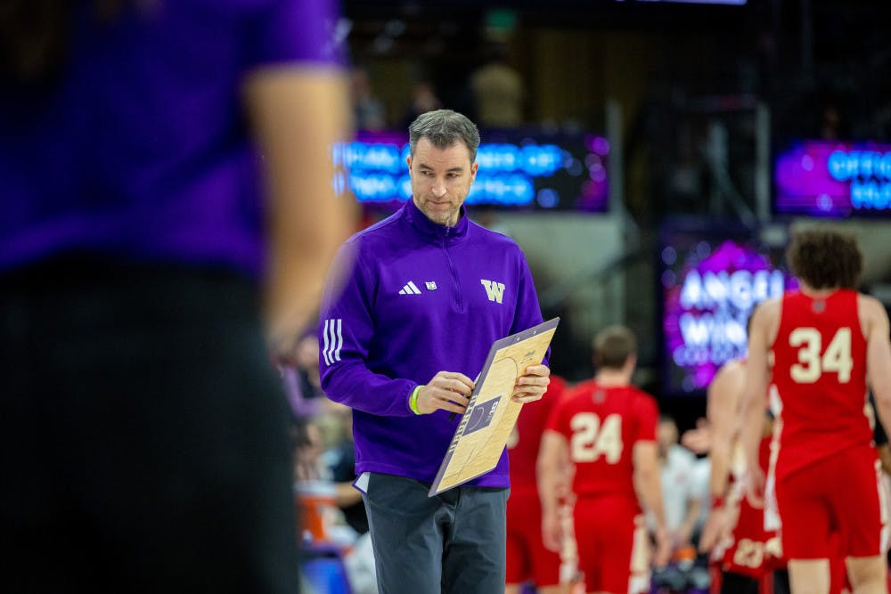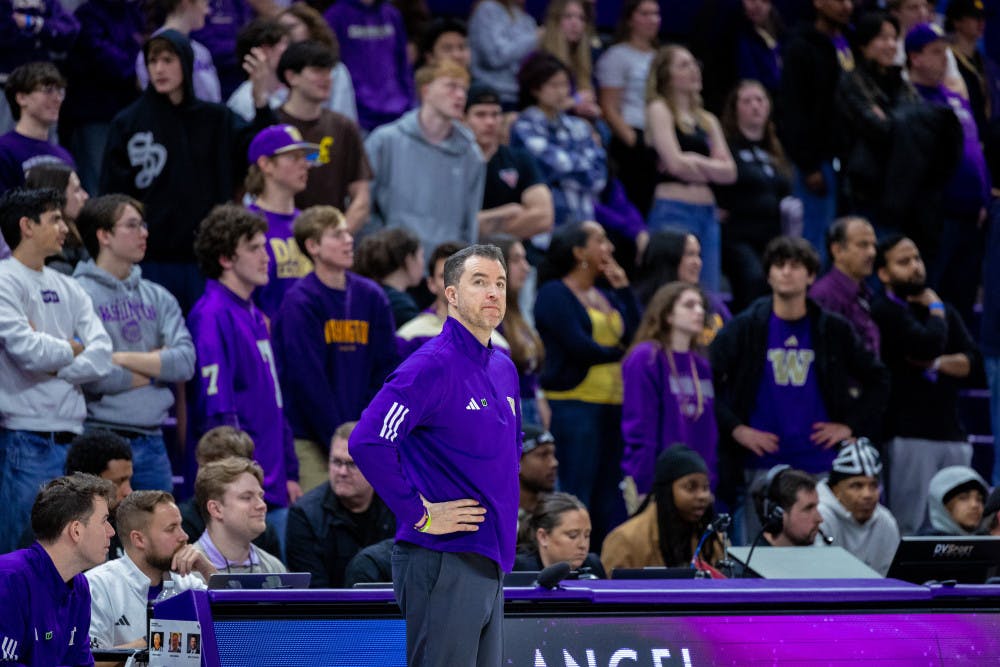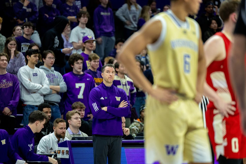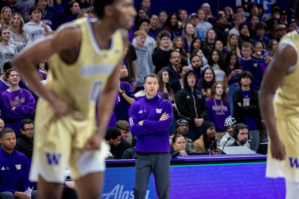 Head Coach Danny Sprinkle watches his players during UW Men's Basketball's loss against Nebraska on February, 5th 2025. at Alaska Airlines Stadium in Seattle, WA.