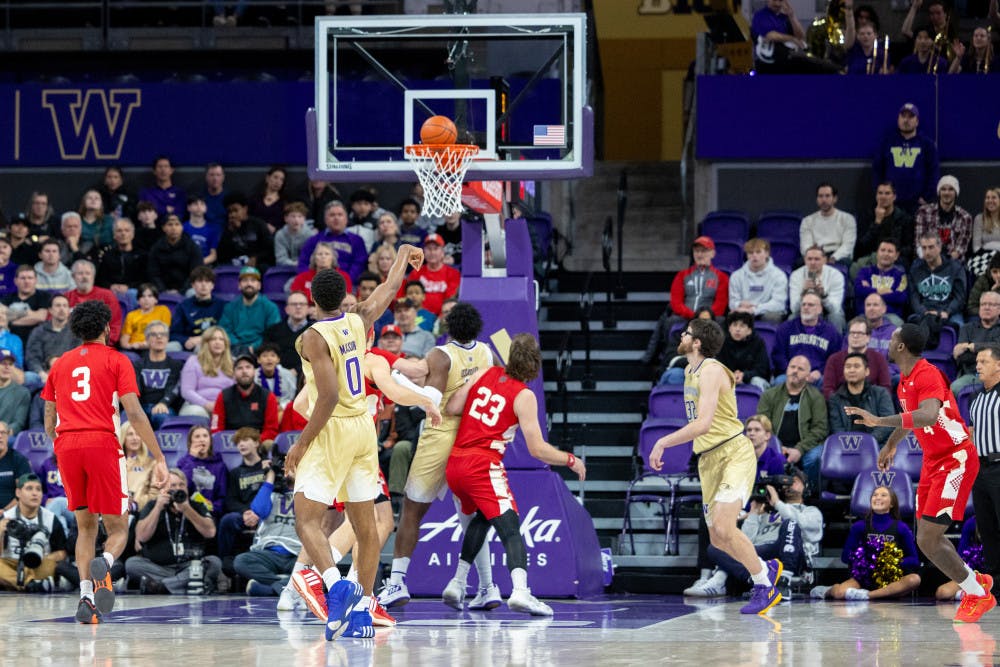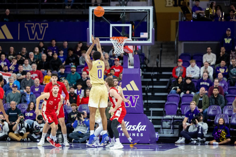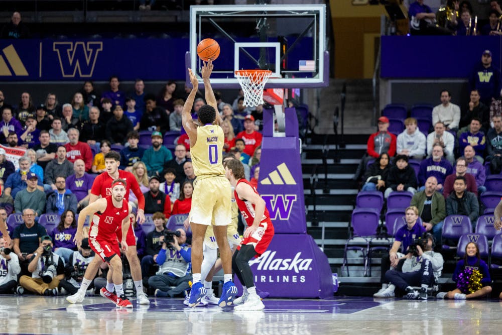 Washington guard Mekhi Mason lines up a three-pointer against Nebraska on February 5th, 2025 inside of Alaska Airlines Arena.