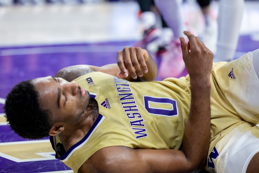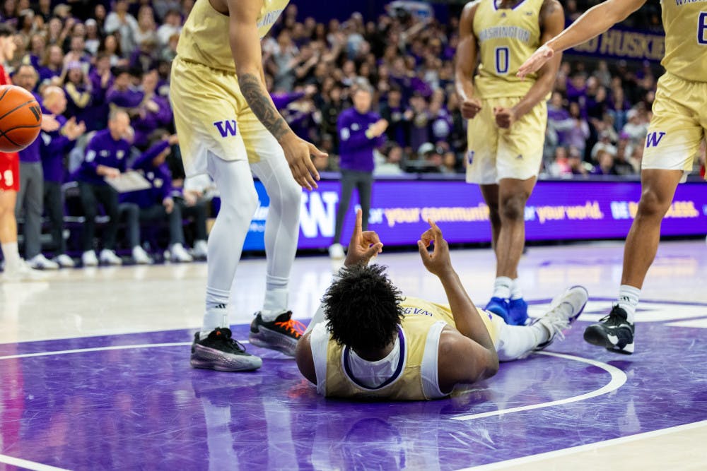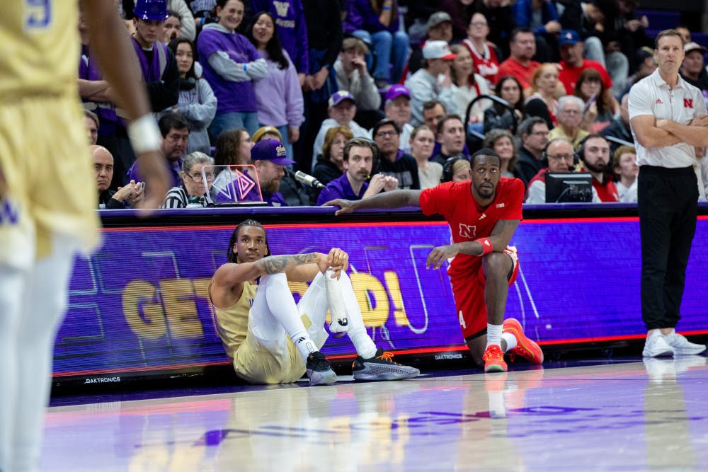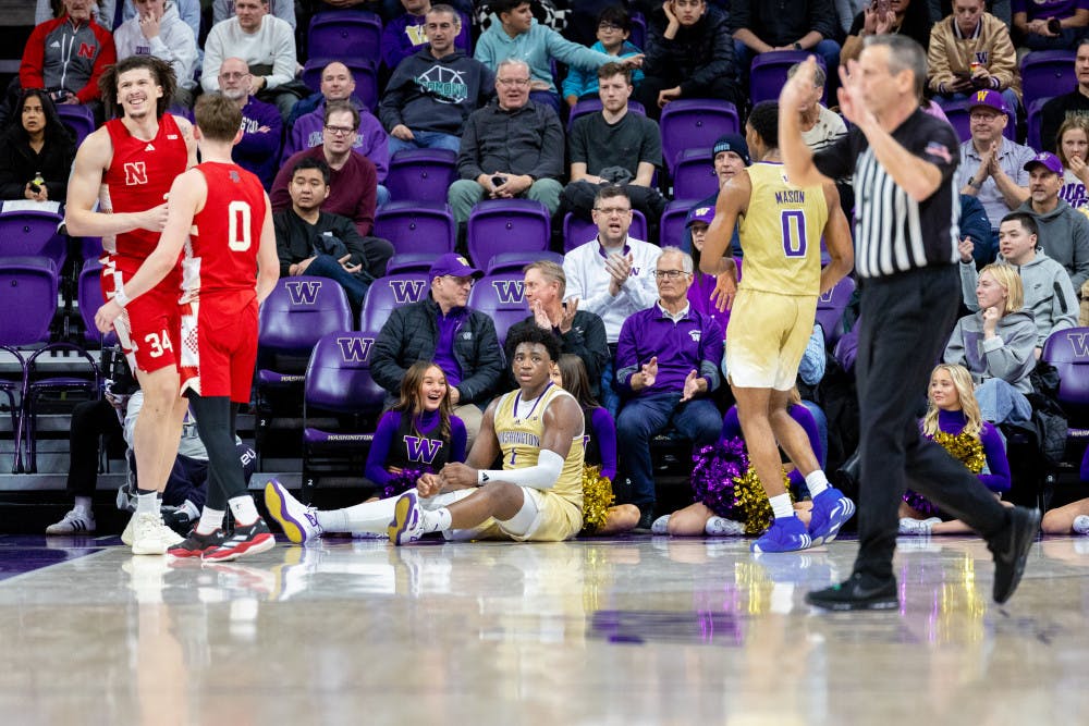 Junior Guard Mekhi Mason falls to the ground during UW Men's Basketball's loss against Nebraska on February, 5th 2025. at Alaska Airlines Stadium in Seattle, WA.