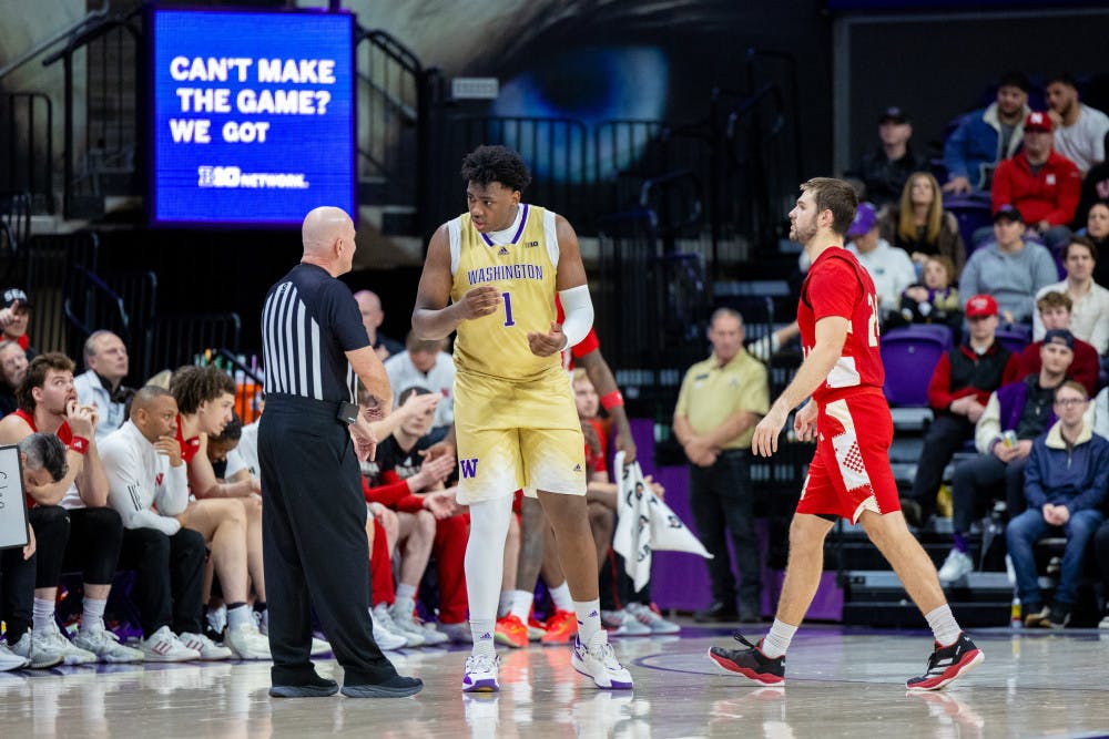 Senior Forward Great Osobor argues with a ref during UW Men's Basketball's loss against Nebraska on February, 5th 2025. at Alaska Airlines Stadium in Seattle, WA.