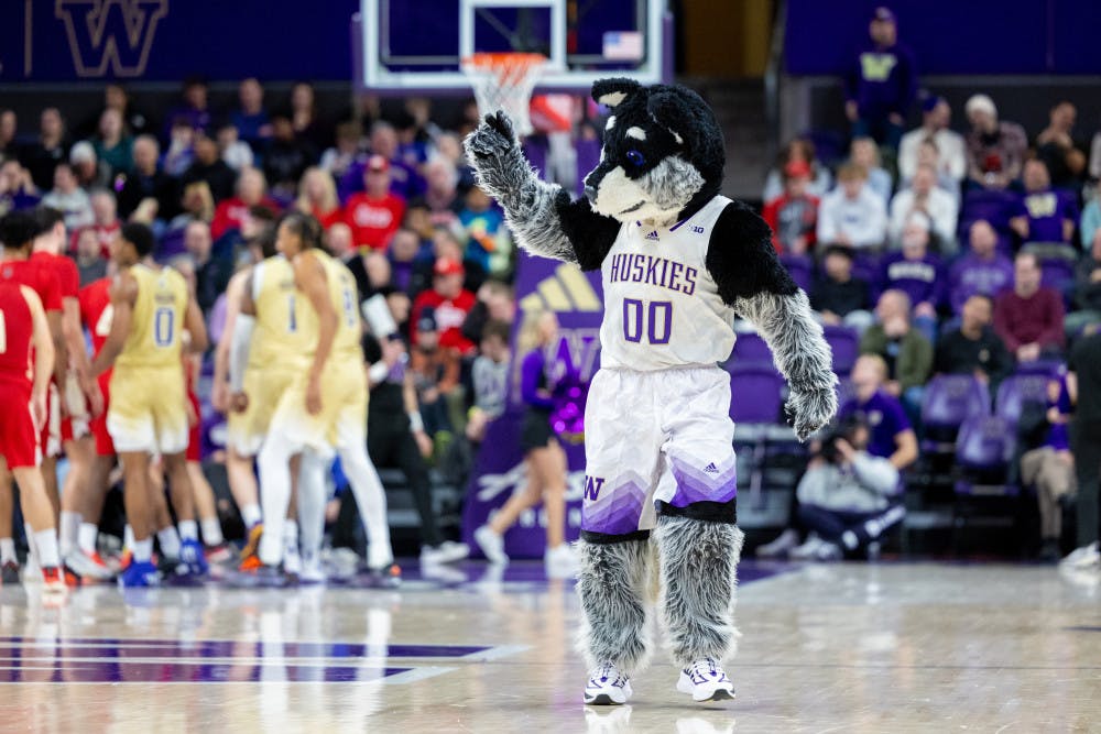 Harry the Husky celebrates before UW Men's Basketball's game against Nebraska on February, 5th 2025. at Alaska Airlines Stadium in Seattle, WA.