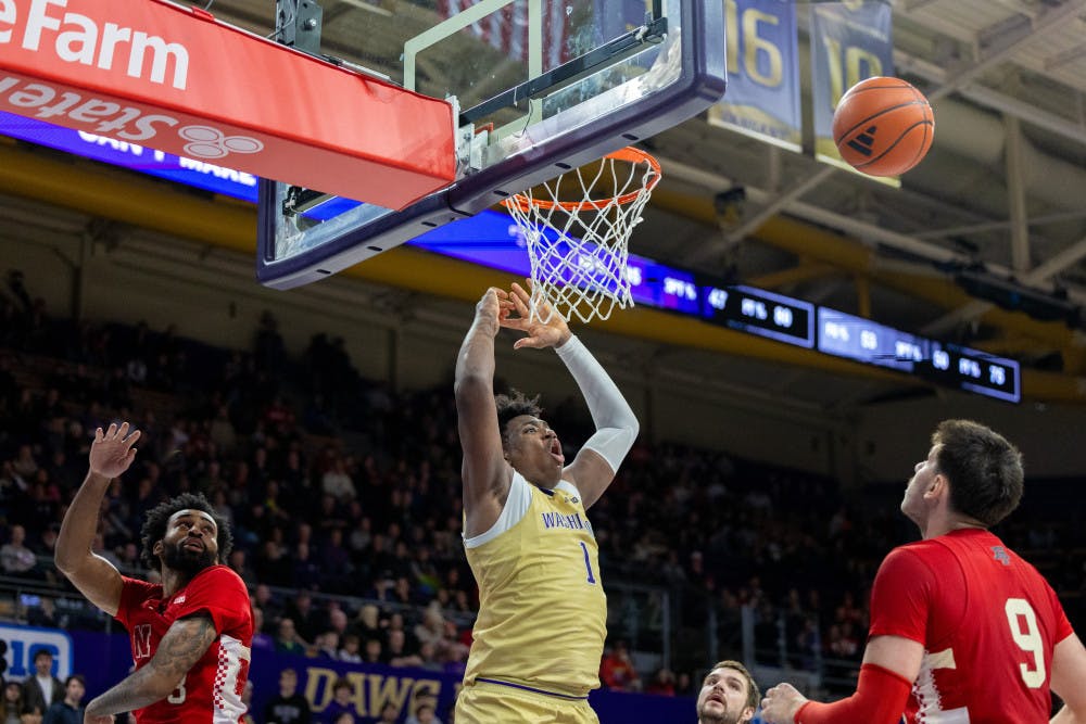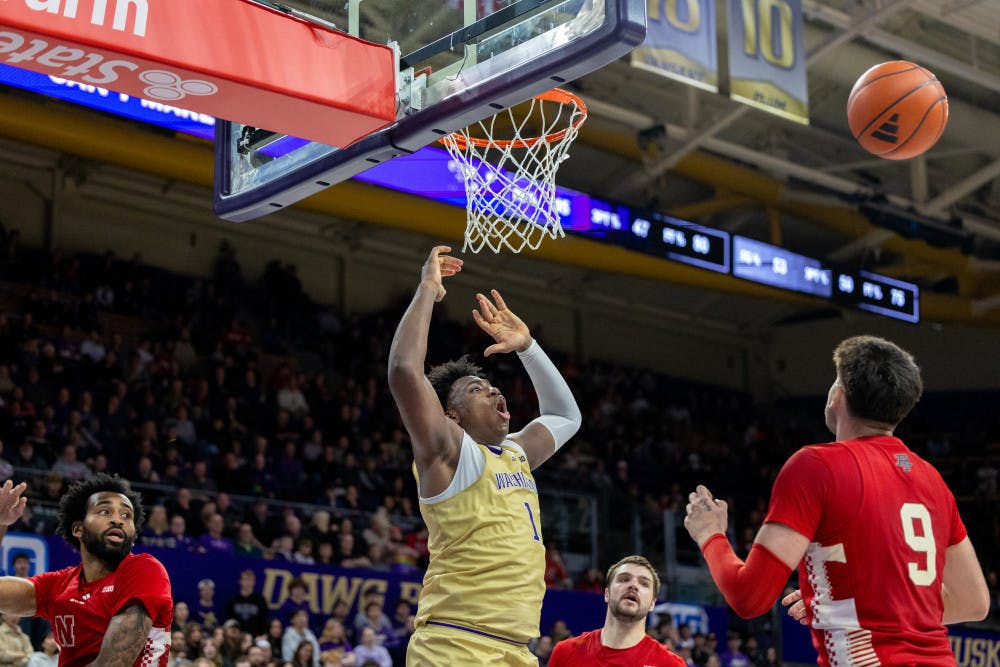 Washington forward Great Osobor drives the basketball toward the hoop against Nebraska on February 5th, 2025 inside of Alaska Airlines Arena.