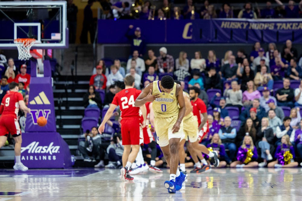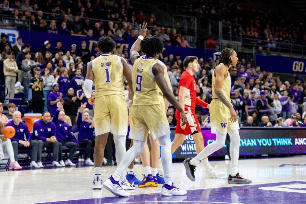 UW celebrate after scoring during UW Men's Basketball's game against Nebraska on February, 5th 2025. at Alaska Airlines Stadium in Seattle, WA.