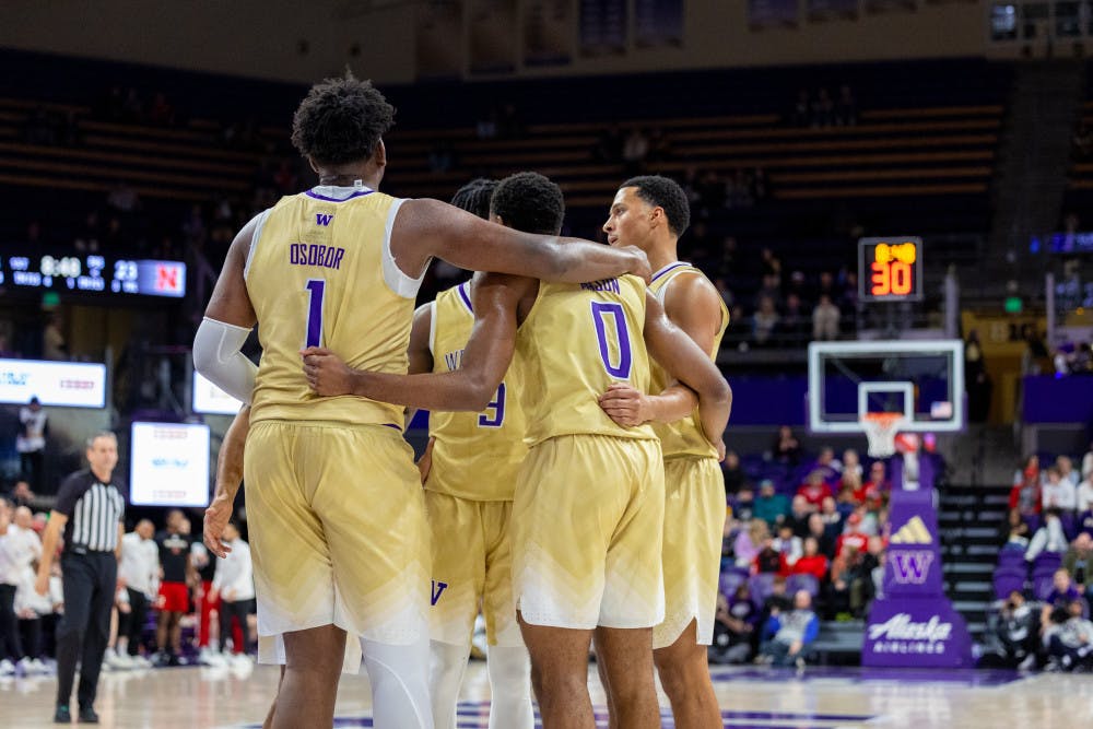 UW players huddle during a stoppage during UW Men's Basketball's game against Nebraska on February, 5th 2025. at Alaska Airlines Stadium in Seattle, WA.