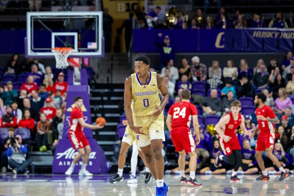 Washington guard Vazoumana Diallo runs down the court against Nebraska on February 5th, 2025 inside of Alaska Airlines Arena.
