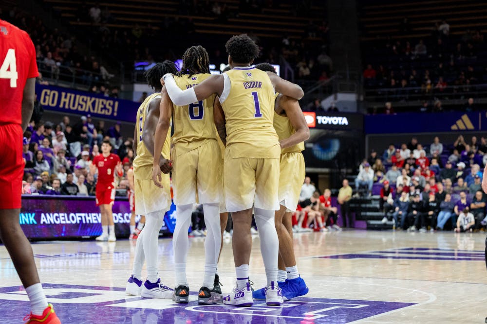 UW teamates huddle during UW Men's Basketball's game against Nebraska on February, 5th 2025. at Alaska Airlines Stadium in Seattle, WA.