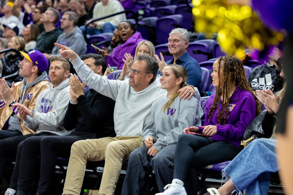 UW football Head Coach Jedd Fisch and his daughter watch UW Men's Basketball's loss against Nebraska on February, 5th 2025. at Alaska Airlines Stadium in Seattle, WA.