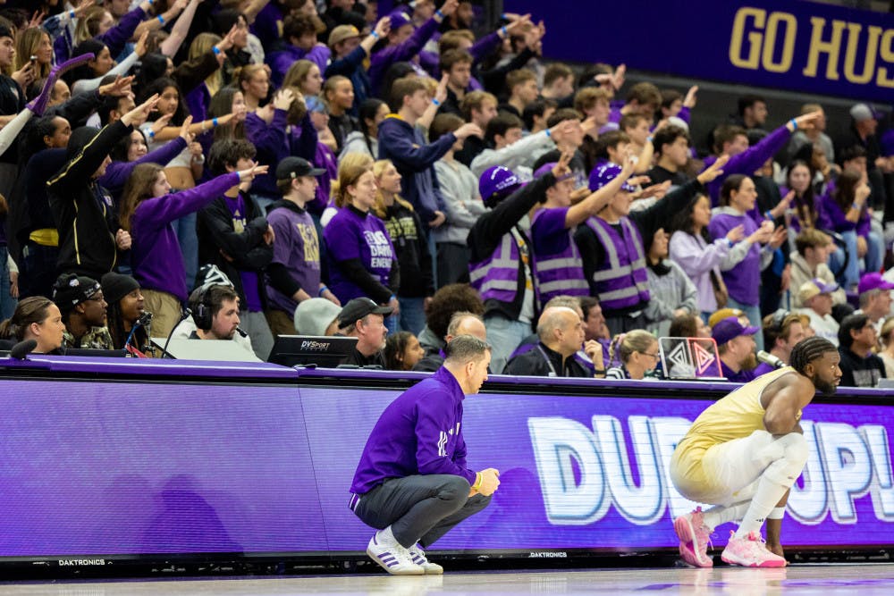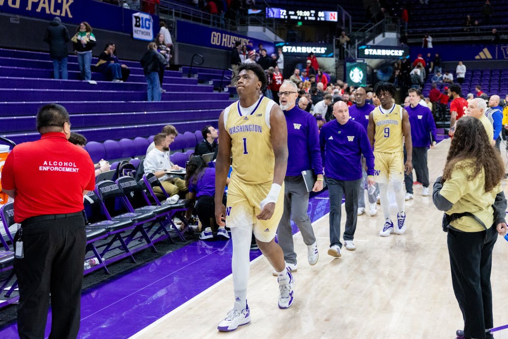 Washington guard Mekhi Mason watches gameplay against Nebraska on February 5th, 2025 inside of Alaska Airlines Arena.