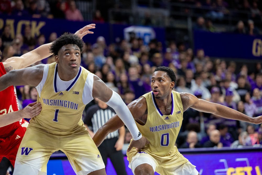 Junior Guard Mekhi Mason and Senior Forward Great Osobor box out an opponent during UW Men's Basketball's loss against Nebraska on February, 5th 2025. at Alaska Airlines Stadium in Seattle, WA.