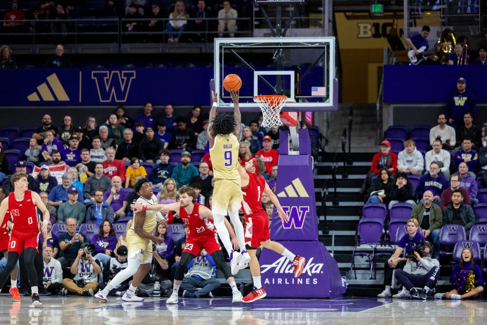 Freshman Guard Vazoumana Diallo shoots a three pointer over a defender during UW Men's Basketball's game against Nebraska on February, 5th 2025. at Alaska Airlines Stadium in Seattle, WA.
