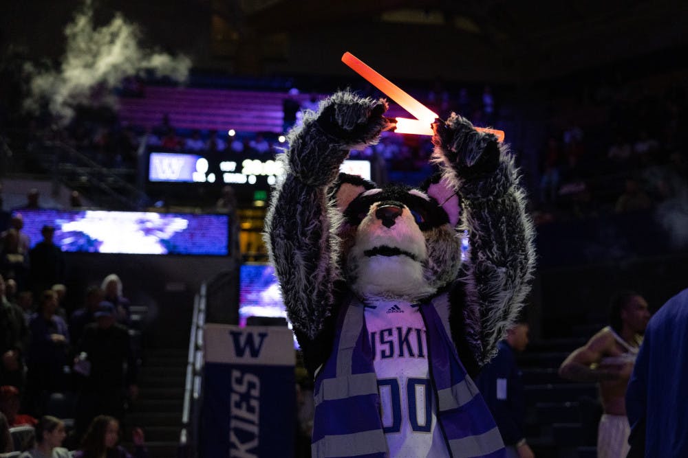 Washington mascot Harry The Husky waves his arms before the Huskies take on Nebraska on February 5th, 2025 inside of Alaska Airlines Arena.