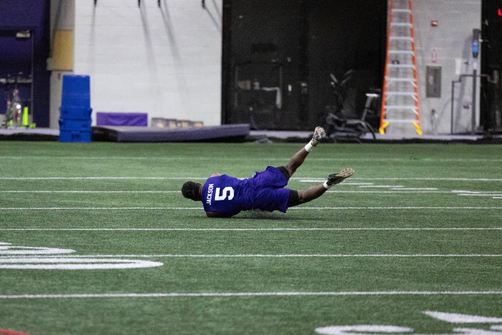 Senior wide receiver Giles Jackson dives to catch the ball during Washington's Pro Day at Dempsey Indoor Center in Seattle, Washington on March 10, 2025.