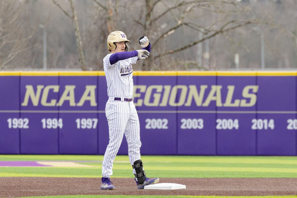 Washington outfielder Julian Sanders runs a double and celebrates against PLU at Husky Ballpark on March 18th, 2025.