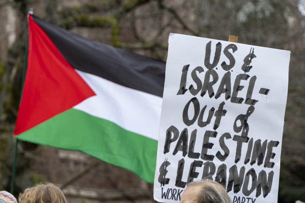 Demonstrators hold flags and signs for SUPER UW's "Flood UW for Palestine" March and Rally at the Quad on Feb. 5, 2025.
