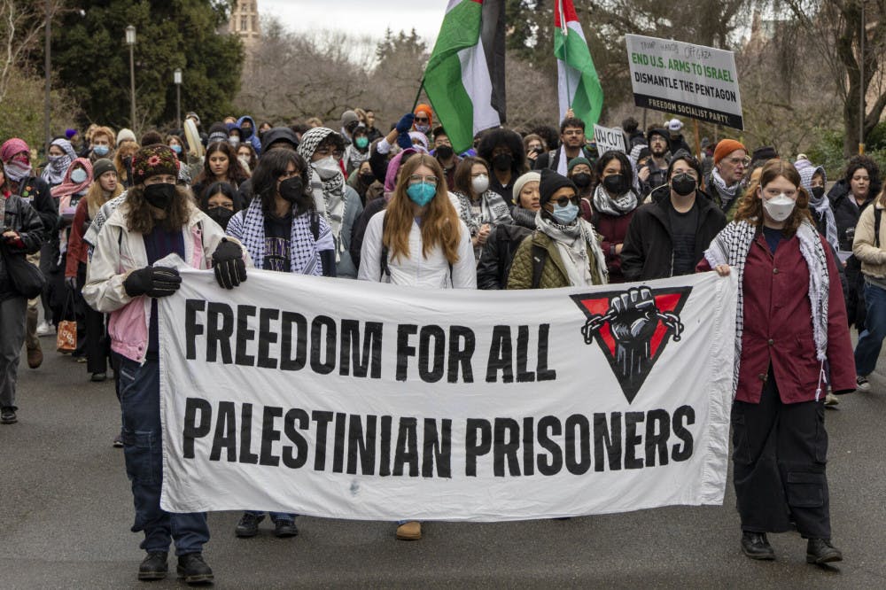 Demonstrators march toward Red Square from the Quad for SUPER UW's "Flood UW for Palestine" March and Rally on Feb. 5, 2025.