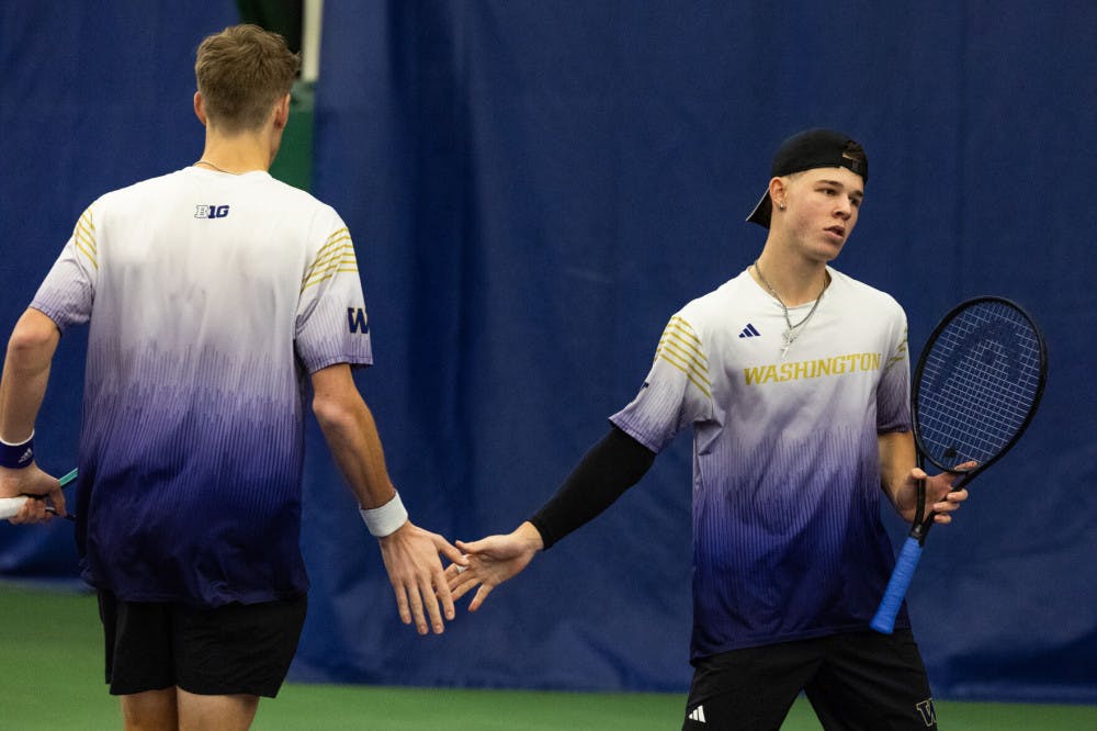 Seniors Dzianis Zharyn and Cesar Bouchelaghem celebrate winning a point during their tennis match against Ohio State at Nordstrom Tennis Center in Seattle, Washington on March 16, 2025.