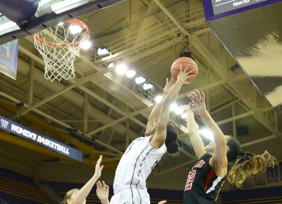 Forward Aminah Williams (center) reaches for one of her 15 rebounds against Utah on Friday night. Williams led the Huskies in rebounding and stopped Utah forward Michelle Plouffe on the final possession of overtime to seal the victory for the UW.