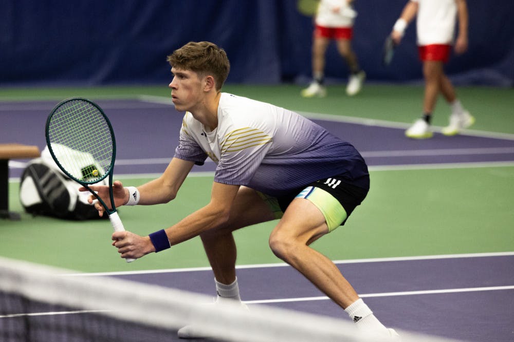 Senior Dzianis Zharyn prepares for the upcoming point during the Washington men's tennis match against Ohio State at Nordstrom Tennis Center in Seattle, Washington on March 16, 2025.