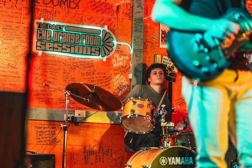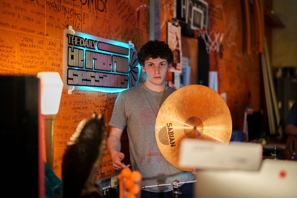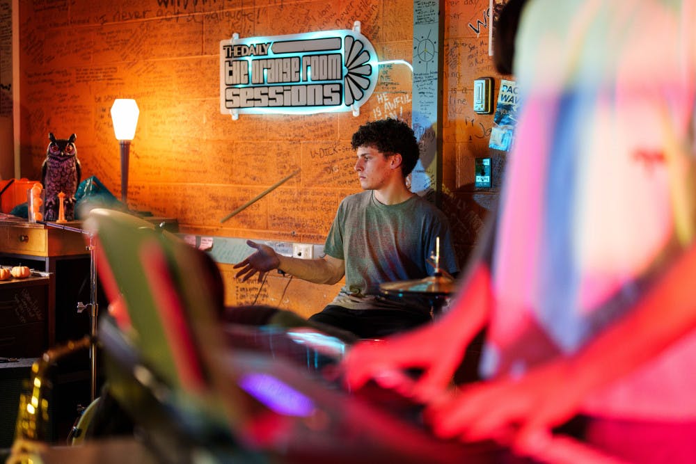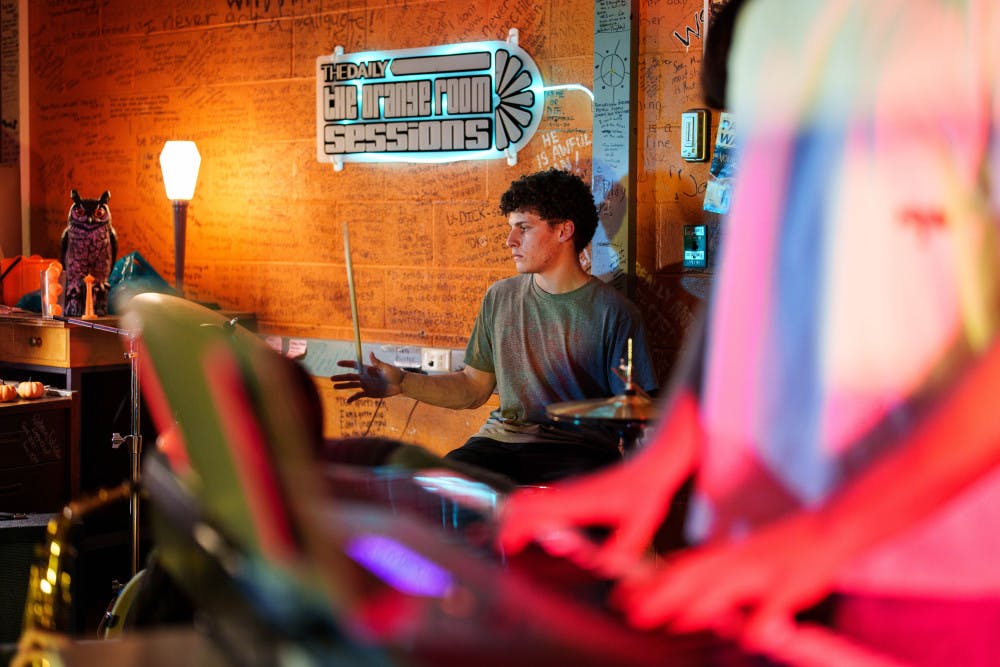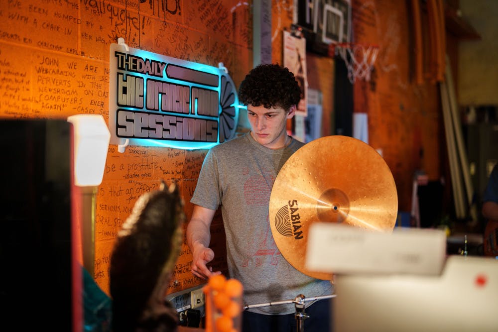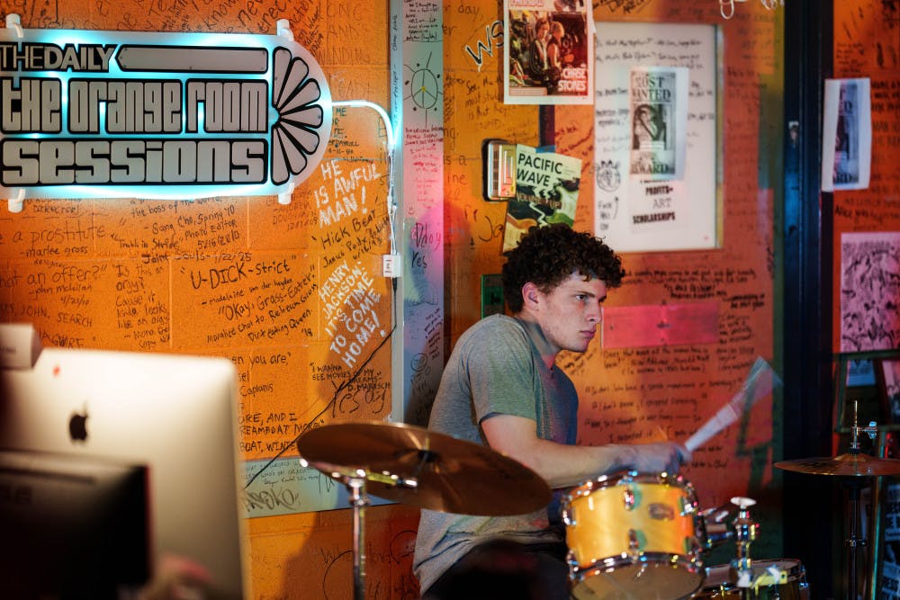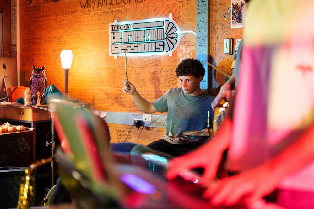 Nico Savoia plays on drums on Jan. 23, 2025 in The Daily's newsroom for the second edition of the 2025 series of Orange Room Sessions.