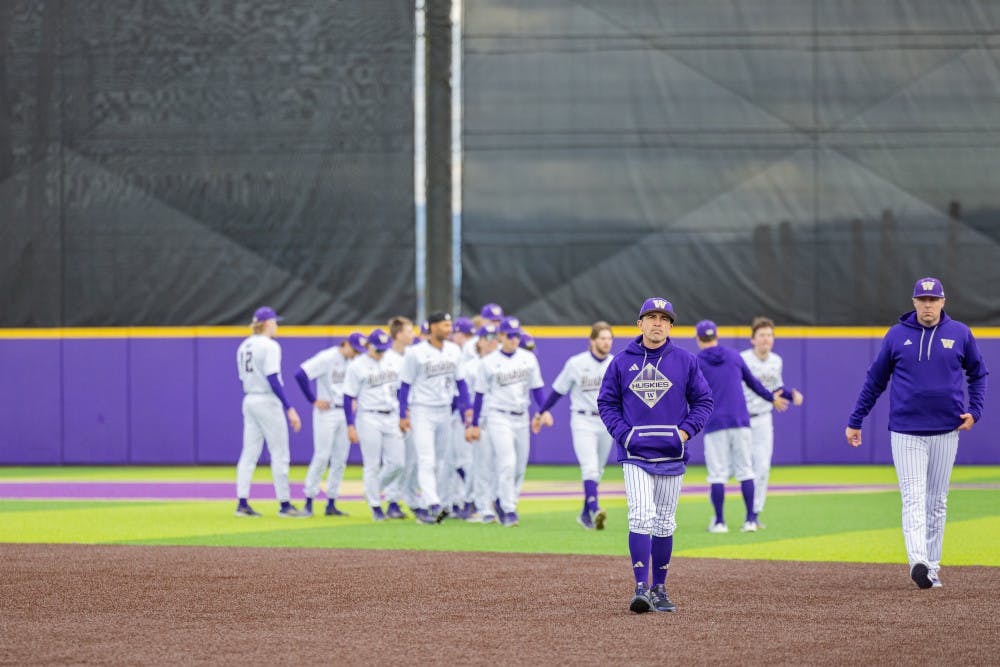 Washington baseball head coach Eddie Smith walks towards the dug-out before their game against Pacific Lutheran University at Husky Ballpark on March 18th, 2025.
