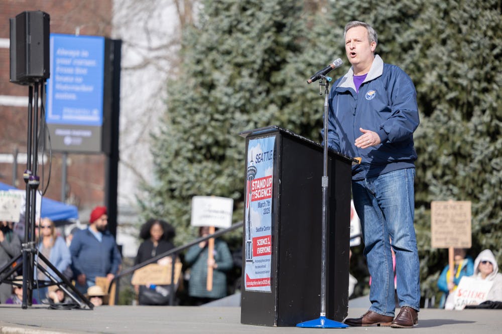 Washington State Commisioner of Public Lands Dave Upthegrove speaks at the Stand Up for Science rally on March 7, 2025 in Seattle Center.