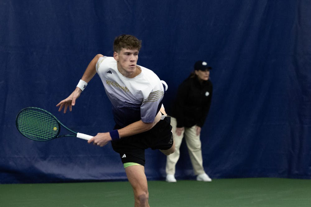 Senior Dzianis Zharyn serves the ball during the Washington men's tennis match against Ohio State at Nordstrom Tennis Center in Seattle, Washington on March 16, 2025.