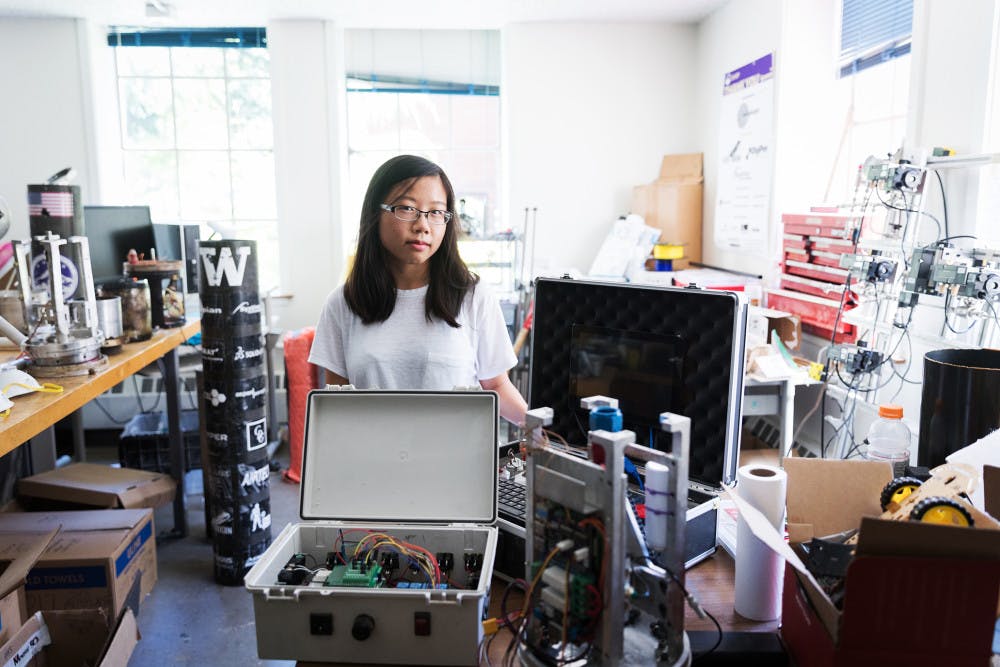 Sabrina Tong, avionics sub-team lead, with various command consoles inside the UW Society for Advanced Rocket Propulsion lab.