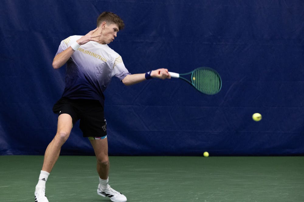 Senior Dzianis Zharyn forehands the ball during the Washington men's tennis match against Ohio State at Nordstrom Tennis Center in Seattle, Washington on March 16, 2025.